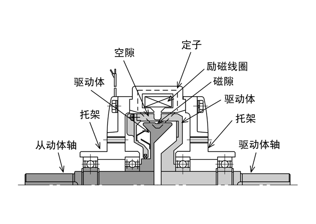 磁粉離合器是由主動轉子(輸入軸)、從動轉子(輸出軸)、含激磁線圈的磁軛組成,三部分相對同心裝配,形成了一個可以相對轉動的整體,在主動轉子和從動轉子之間的環形空隙(工作腔)內填有高導磁的合金磁粉。而對構成磁粉離合器磁路的各種磁體,一般都應選用導磁率高,矯頑力低和單位損耗小的軟磁材料制成,這些材料均須要經過適當的熱處理以得到良好的磁性能。對于使用不太重要的離合器,可以采用比較經濟的鑄鐵系做導磁體。當需要減少導磁體的渦流影響,縮小轉矩時間常數時,可采用電阻率較高的材料,比如硅鋼、鐵鋁系合金等。