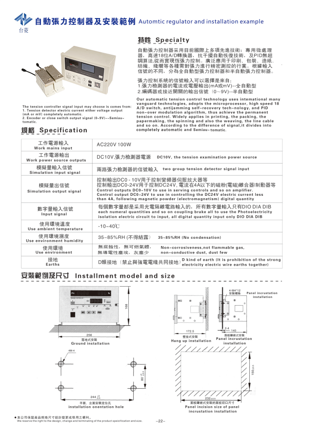 全自動(dòng)張力控制器是一種高精度、多功能的全數(shù)字智能型張力控制器,配合張力檢測(cè)器組成閉環(huán)張力控制系統(tǒng)。通過接收張力檢測(cè)器傳送的信號(hào),經(jīng)內(nèi)部PID運(yùn)算處理后,調(diào)節(jié)執(zhí)行機(jī)構(gòu),自動(dòng)控制材料的收/放卷張力。全自動(dòng)張力控制器采用全新的圖形液晶顯示器,中、英文顯示更清晰,并針對(duì)磁粉離合器/制動(dòng)器發(fā)出0~24VDC的控制電壓指令,也可輸出0~10V電壓信號(hào)控制變頻器、伺服電機(jī)或其他執(zhí)行機(jī)構(gòu)對(duì)卷料進(jìn)行高精度的張力控制。